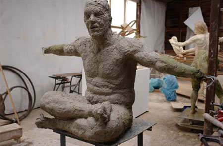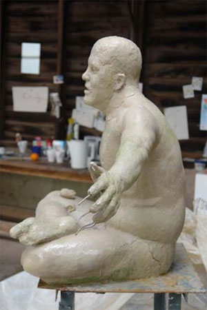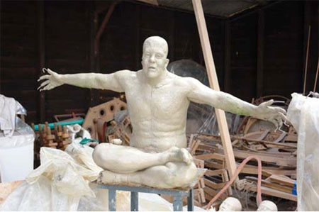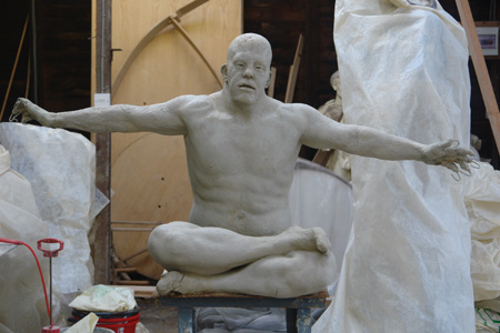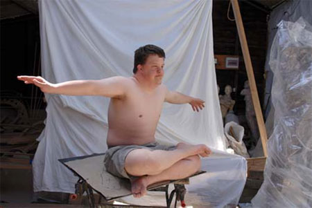 The confident pose of the model shows his arms outstretched with his palms open in a poetic manner, revealing the characteristic palm crease found in both hands of individuals with the condition. The model sat cross-legged revealing the flexibility of the ligaments most individuals with this condition share. The implied movement of George's mouth shows him enunciating speech. George has mild verbal apraxia, which some individuals with the condition have, and their speech is sometimes difficult to understand. However the artist has learnt that time spent with George, enables him to understand his speech more. That said; the pose expresses George's self-confidence in social situations.