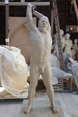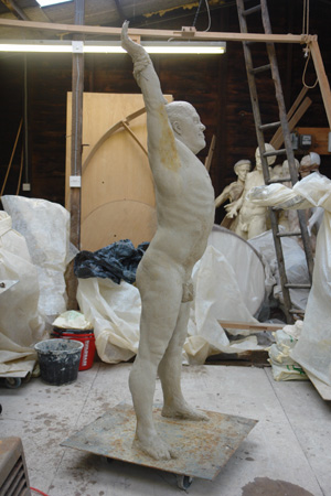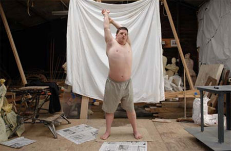 This piece offers viewers of the works an introduction into the possible reasons for mental retardation in individuals with the condition and to learn something of current the research currently taking place at the New Centre for Down's Syndrome, Stanford University. The research team at Stamford University is led by Professor William Mobley and has the aim to correct this malfunction through medication. The figure sculpture shows the arms raised supporting the apparatus above his head, whilst also revealing the characteristic palm crease in each hand as noted in Two Palm Creases.