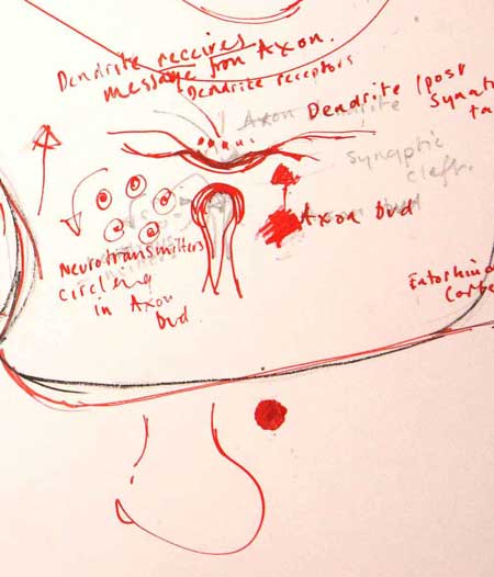 Detail from preceding sketch, Fig: 2. Illustration of a synapse - the meeting of the dendrite and axon in a neuron (nerve cell)