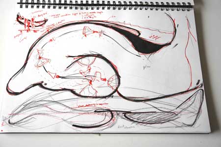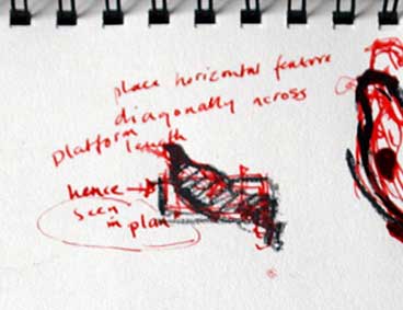 Pen and ink sketch (detail), showing proposed yoke-like timber apparatus illustrating the hippocampus and subject stood within. Plan view. 22 August 2006.