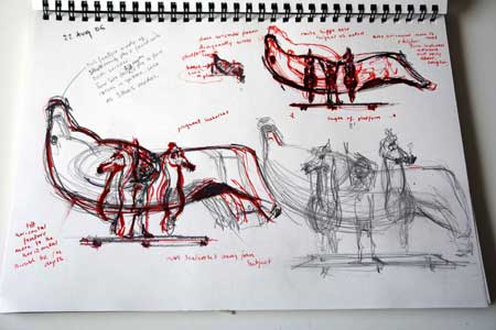 Pen and ink sketch (detail), showing proposed yoke-like timber apparatus illustrating the hippocampus and subject stood within. Front elevation. 21 August 2006.