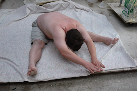 The photograph of George stretching was taken during photography of newer photographs for the composition of the sculpture Stretch and Burn. George attends gym workouts, and stretching is usual for George when relaxing between gym exercises. The artist found the composition a powerful and dynamic image, but feels it is also representative of the strength and vigour of male youth in general, which George, despite his condition, obviously shares with those of general ability, and his physique seen here illustrates this well.