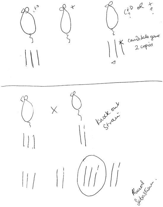 A diagram trying to illustrate how certain strains of mice might be studied in order to find out which genes underlie specific traits that arise in Down's syndrome. Drawn during Dr. Elizabeth Fisher's meeting with the artist.© Dr Elizabeth Fisher, 7 June 2006, biro ink.