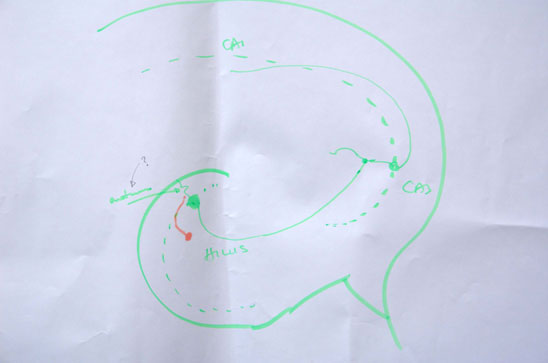 Sketch showing the hippocampus in section and the brain circuit within: Dentate Gyrus, bottom left and neurons CA3 and CA1. © Prof. William Mobley & Charles Walker Hazzard