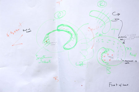At their meeting at the 'Bright Beginnings' conference, Institute of Child Health, London, 1 April 2006 organised by the Down's syndrome Research Foundation; Professor William Mobley discussed his research with the artist. Professor Mobley illustrated his research on the Hippocampus, by way of sketches drawn during this meeting.