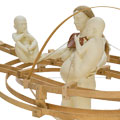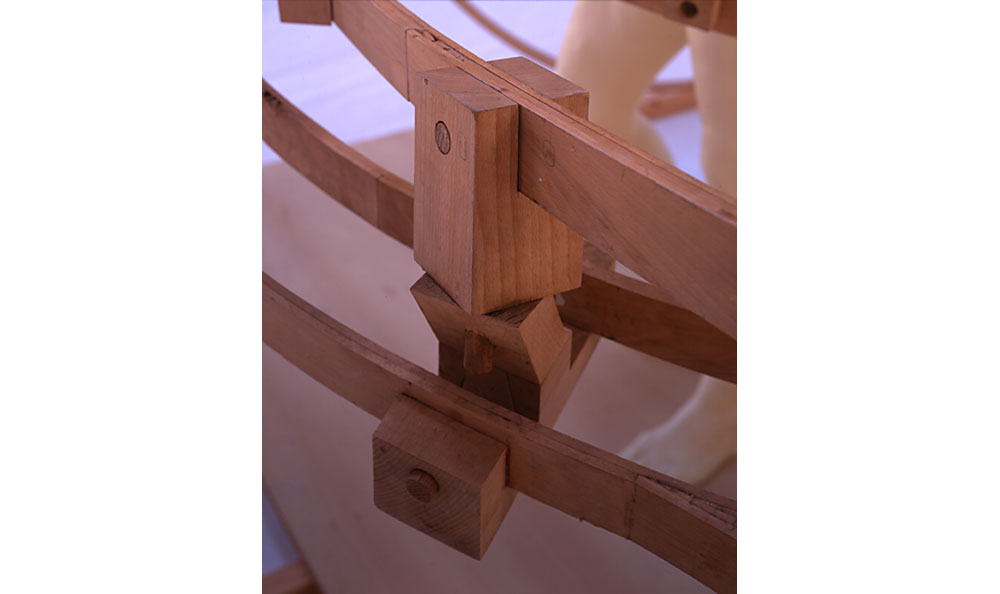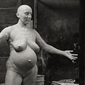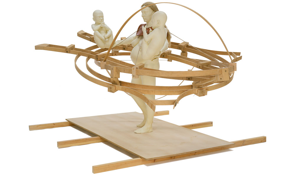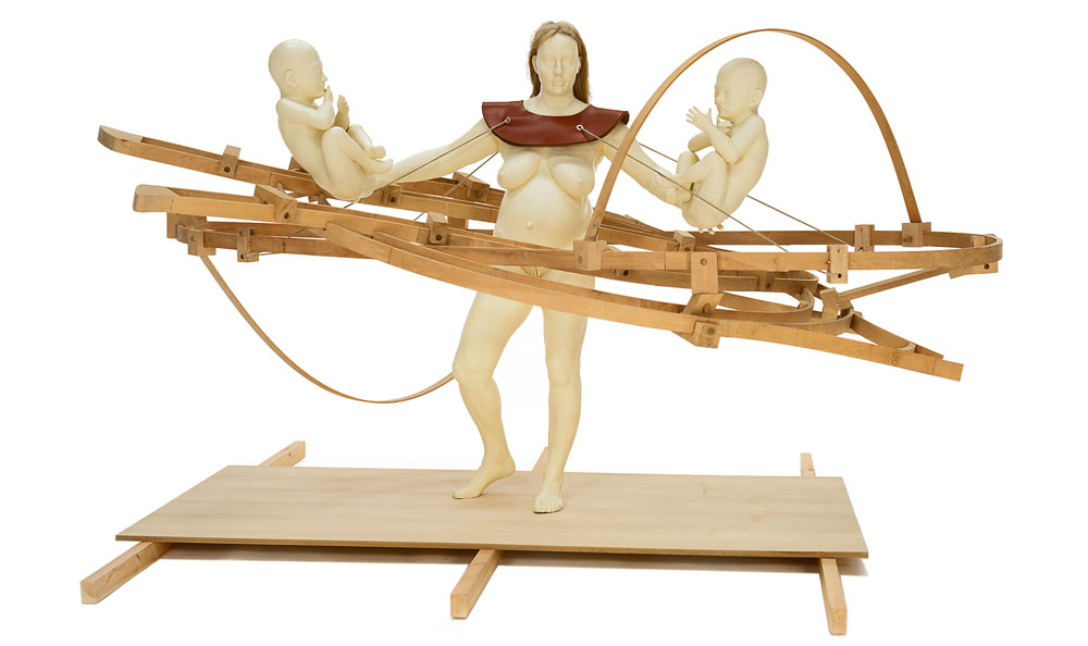 This work as with The Kick Inside is concerned also with pregnancy. This piece possesses a surreal quality, beyond that usually indicated by the over scale of the wooden assembly. The oversize of the unborn twins, displayed as outside the womb, seen as cradled in the hands of the soon to be Mother, highlights the surreal presence of the work. The wooden surround illustrates the uterus with dual replete embryonic sacs.